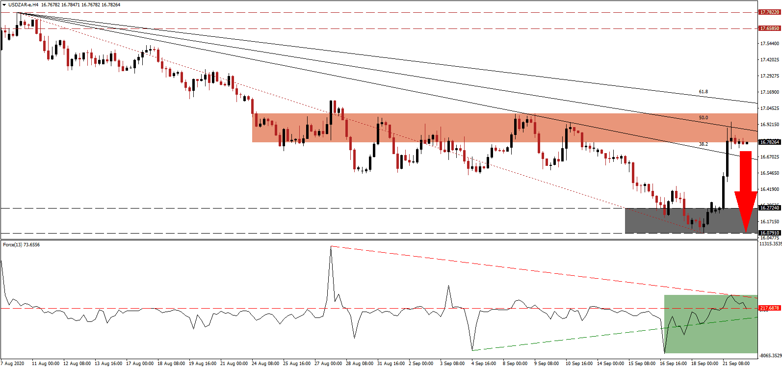 After the South African Reserve Bank (SARB) left interest rates unchanged, Governor Lesetja Kganyago added that the 300 basis points of interest rate cuts of 2020 have not filtered through the economy. The central bank also suggested that third-quarter GDP could surge by 45.2%, while the full-year outlook remains for a decrease of 8.2%. A breakdown in the USD/ZAR below its descending 38.2 Fibonacci Retracement Fan Support Level will allow for an extended sell-off into its support zone located between 16.0791 and 16.2724, as identified by the grey rectangle.