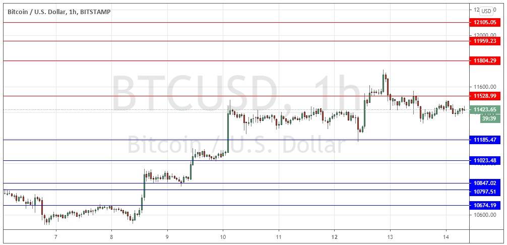 Yesterday’s signals were not triggered, as there was insufficiently bullish price action when the support level identified at $11,448 was first reached.