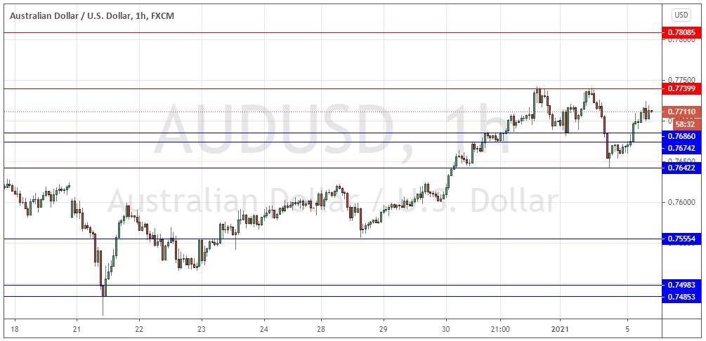 I will be happy to take a long trade if we get two consecutive hourly closes above 0.7740 later, or if we see a bullish bounce at any of the three nearby support levels I have identified above.