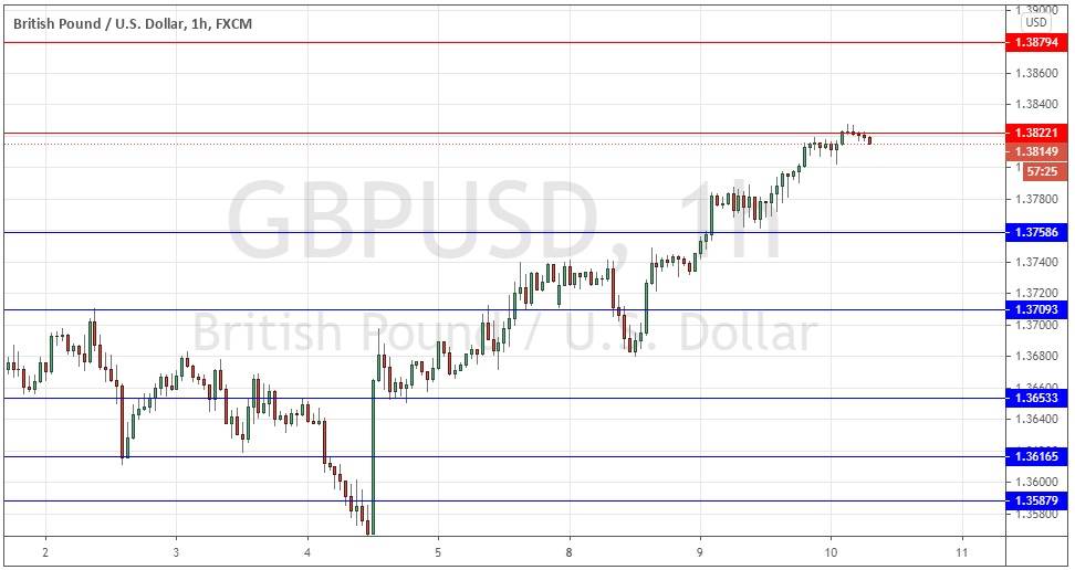 I am confident enough to take a bullish bias here if we get two consecutive hourly closes above 1.3825 after London opens, or if we get a bullish bounce following a retracement to the support level at 1.3759.