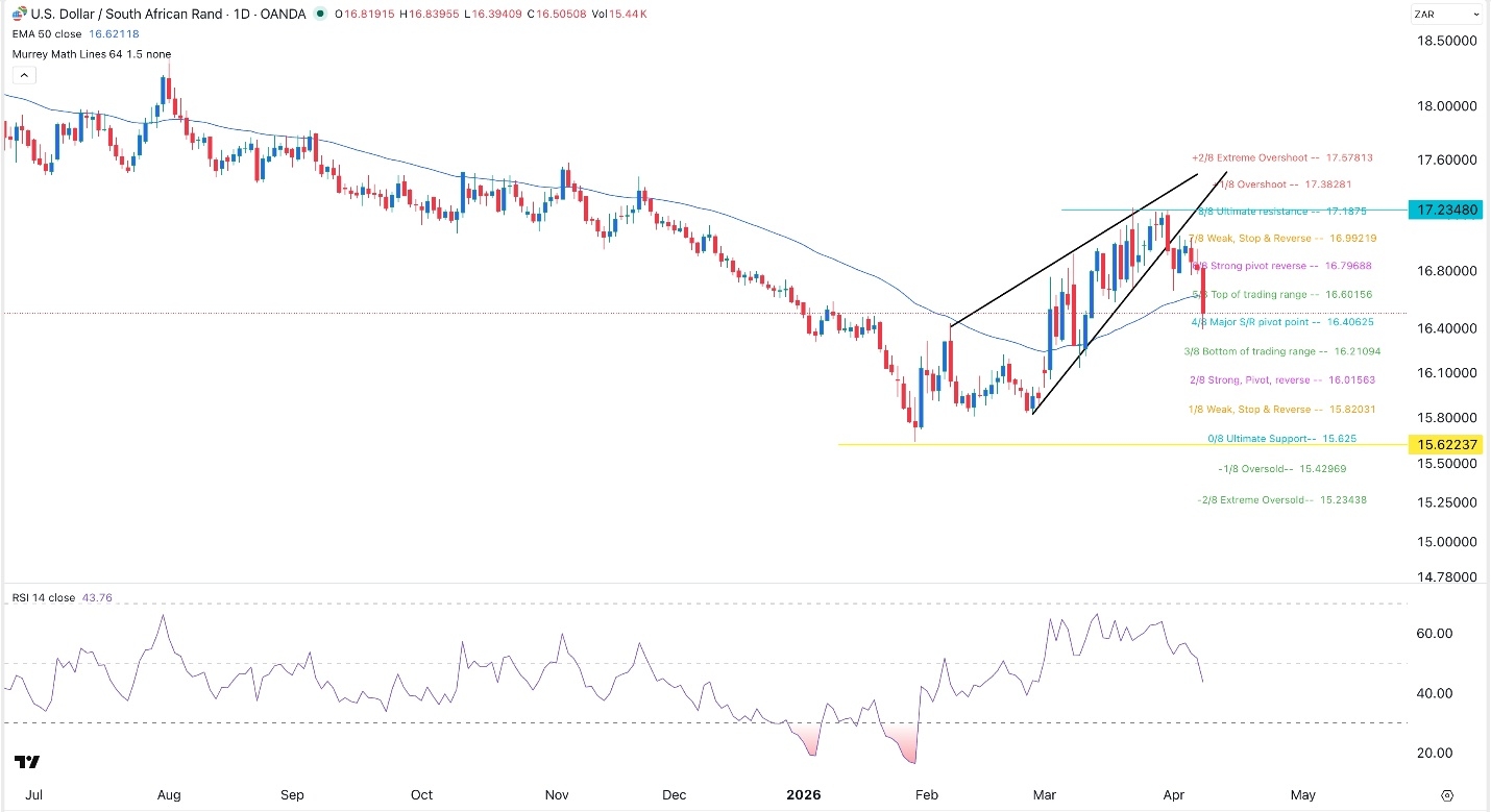 The pair has slumped to the Major S&R pivot point of the Murrey Math Lines tool at 16.40. It also dropped below the 50-day Exponential Moving Average, while the Relative Strength Index (RSI) dropped below the key support level at 50.