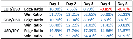 So, let’s look at the results for the first five days after a hypothetical entry when the price meets these moving averages criteria for some major Forex currency pairs over the period 2001 to 2017.